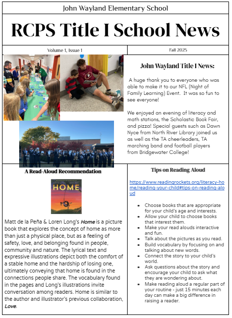 In this edition of the Jaguar Jiggy Journal, you’ll find helpful updates and opportunities across our school community. We’re highlighting our library resources, sharing a special chance for some families to visit our National Parks at no cost, and offering ways to support one another during the holiday season. This issue also features our cafeteria manager in the Teacher Feature, along with a few simple, fun ideas for practicing reading skills while traveling. You’ll find announcements from our PTO, the latest Title I newsletter, and the updated monthly menu. And as always, we’ve included information about ordering John Wayland spirit wear and an up-to-date calendar of upcoming events.